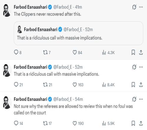 裁判在沒有哨子的情況下主動(dòng)看回放給哨引發(fā)了快船記者Farbod Esnaashari的不滿,他表示:我完全不明白裁判在沒有響哨的情況下看回放是什么意思,這明顯是一個(gè)違規(guī)的行為,那是一個(gè)黃滅的決定,而且影響是極其深遠(yuǎn)的。