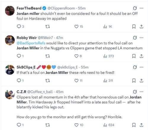 很多的快船球迷也開始吐槽裁判:1.請(qǐng)裁判注意一下,你們吹罰米勒對(duì)小哈犯規(guī)那球絕對(duì)是個(gè)誤判,那個(gè)球破壞了快船的勢頭;