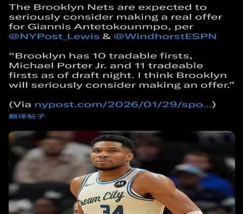 據ESPN名記 Windhorst和籃網隊記Lewis聯合報道,籃網預計將認真考慮一波為字母哥提供一份正式報價。