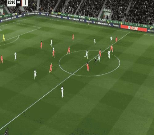 第40分鐘,德容無私傳球,費蘭·托雷斯無人盯防,終于將球打進。半場結束,巴薩狂轟17腳,獲得大把機會,卻只取得了1球的領先。