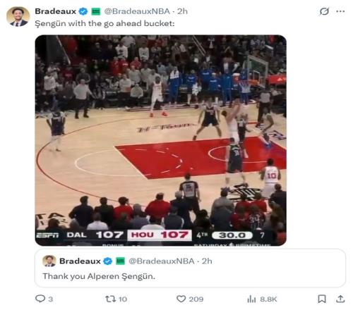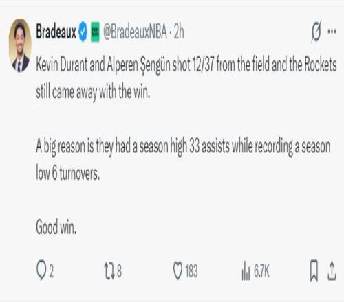 賽后火箭記者Bradeaux也為申京、杜蘭特辯護,這兩人本場比賽37中12手感不佳,但火箭還是贏球了,因為這兩人合力送出15次助攻,全隊33次助攻只有6次失誤。