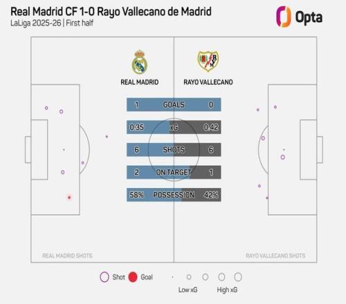 西甲第22輪,皇家馬德里主場對陣巴列卡諾,上半場戰罷,皇馬1-0領先,皇馬在上半場僅完成6次射門,為球隊本賽季主場比賽上半場第二少。