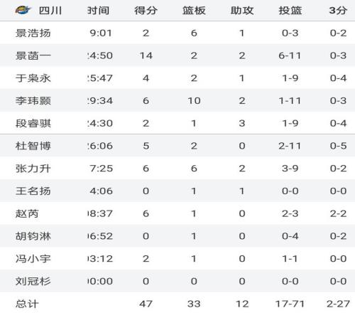 這場比賽,四川男籃真是刷新了職業(yè)球隊(duì)的下限,全隊(duì)12人,有11人上場,結(jié)果就景菡一1人得分上雙,其他人的命中率完全可以用慘不忍睹來形容,下面是本場比賽四川隊(duì)的賽后數(shù)據(jù):全場投籃71次,但是只命中17球,命中率僅為23.9%,其中球隊(duì)三大首發(fā)于梟永投籃9中1,李瑋顥投籃11中1,段睿騏9中1,三大主力合計(jì)29中3,命中率剛過10%。此外,四川這場全隊(duì)三分27中2,命中率僅為7.4%,要知道,很多都是空位三分,結(jié)果就投出這樣的命中率,著實(shí)有些離譜。