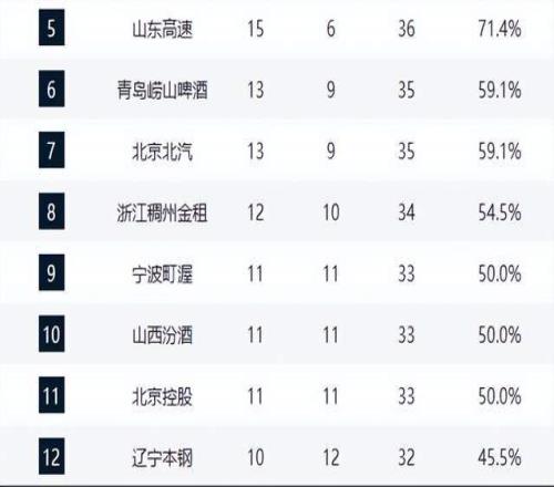 黑馬深圳與山東分列第四、第五,山東少賽一場但勝場占優,理論上排名第四。兩隊近期狀態火熱,10戰8勝,展現出強勁的競爭力。另一黑馬青島隊擊敗北京止住五連敗頹勢,排名第六;北京則遭遇兩連敗,排名下滑至第七,球隊磨合問題與主教練許利民的用人策略備受質疑。浙江隊雖位列第八,但本輪負于廣廈暴露了與頂級強隊的實力差距。