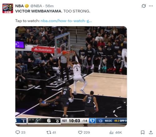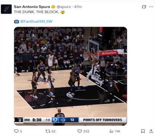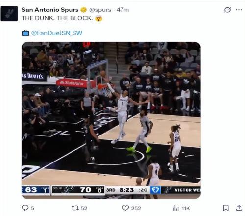 末節馬刺直接一波流帶走比賽,貝恩還對文班亞馬進行了報復性的撞擊,瘦弱的光頭直接被頂飛出去,但文班亞馬戰意更濃籃下連續得分,魔術很快放棄了比賽,文班亞馬末節拿到7分。