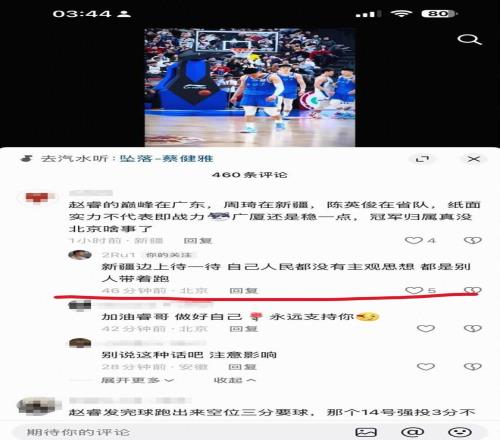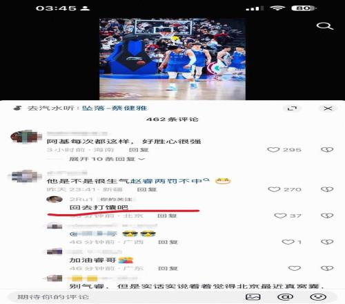 賽后,在社交媒體上出現(xiàn)了批評(píng)北京和趙睿的內(nèi)容,據(jù)網(wǎng)傳圖片顯示,北京后衛(wèi)趙睿現(xiàn)身評(píng)論區(qū),回復(fù)了兩名IP屬地新疆的球迷。